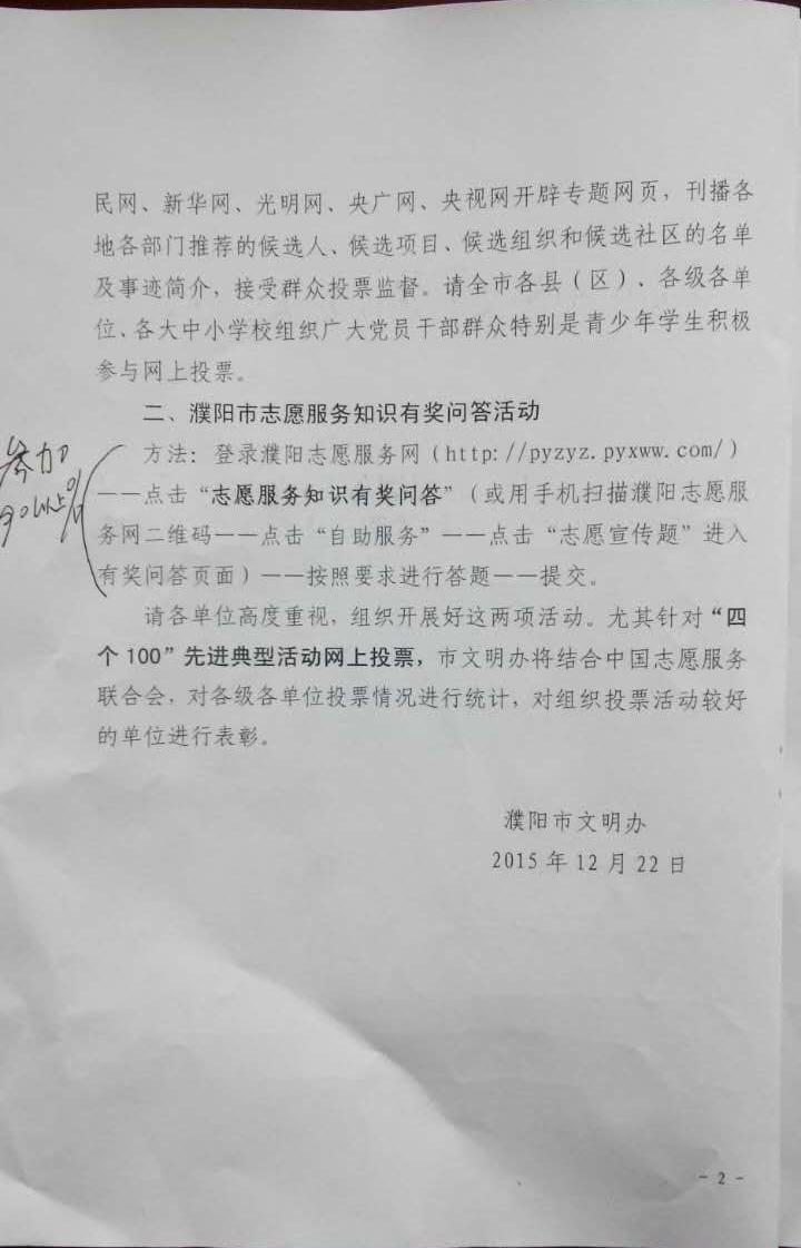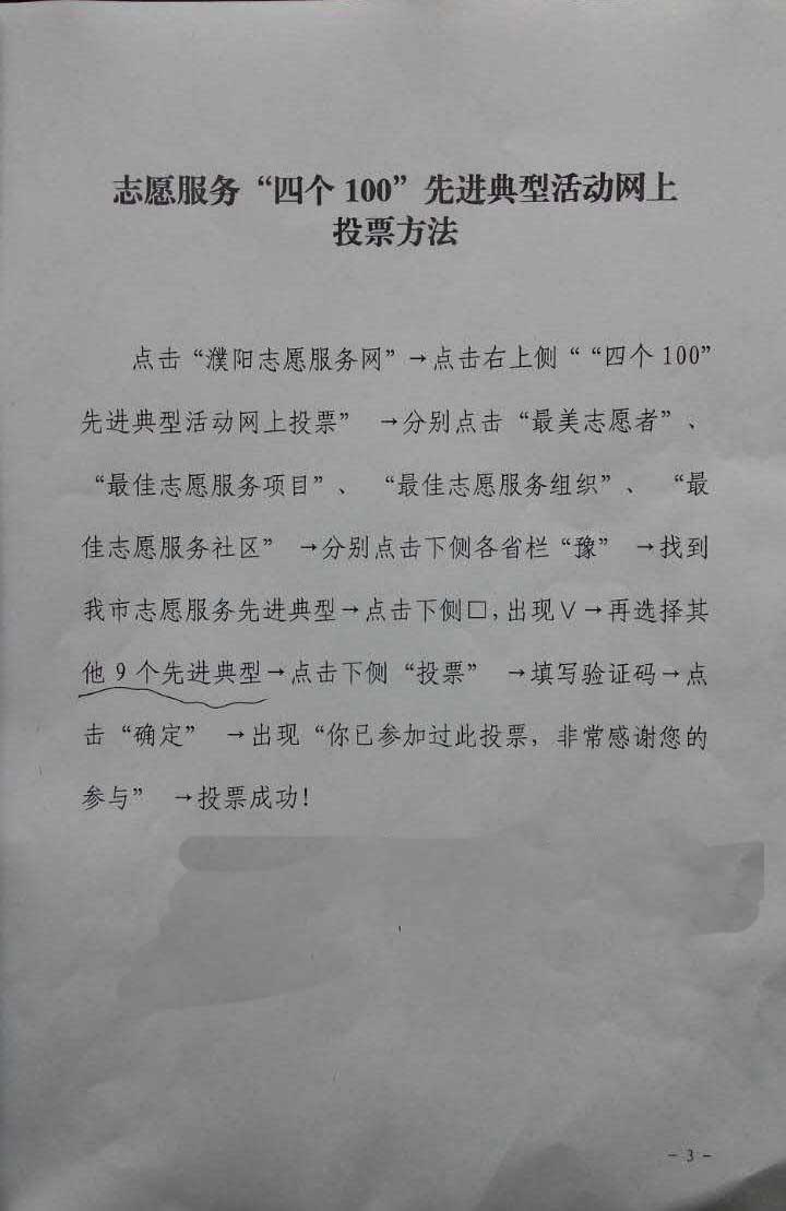 关于开展全国志愿服务“4个100”先进典型网上投票活动和濮阳市志愿服务知识有奖问答活动的通知